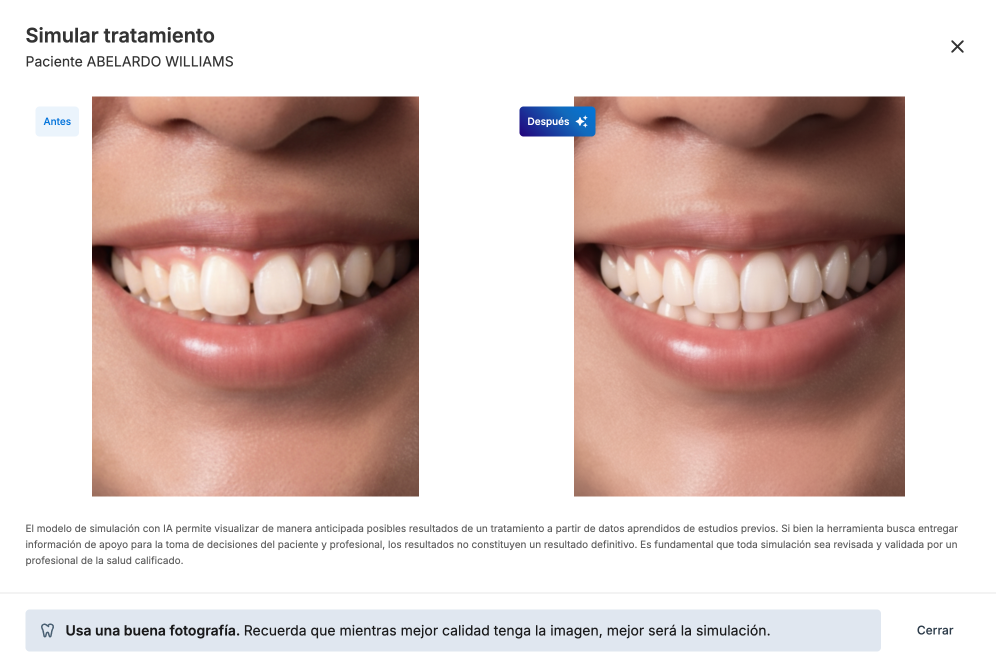 Sube una foto actual de la boca de tu paciente al software y pide a la Inteligencia Artificial de Dentalink que genere una imagen de cómo quedará luego del tratamiento. ¡Listo! En segundos podrás enseñarle a tu paciente una foto de alta calidad con su futura sonrisa.